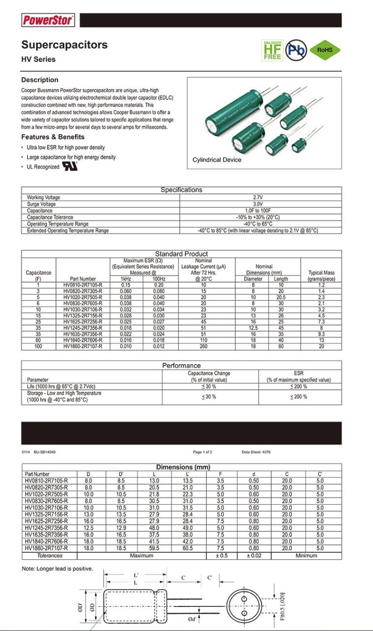 HV1030-2R7106-R 高壓超級電容器 圓柱綠色超級電容