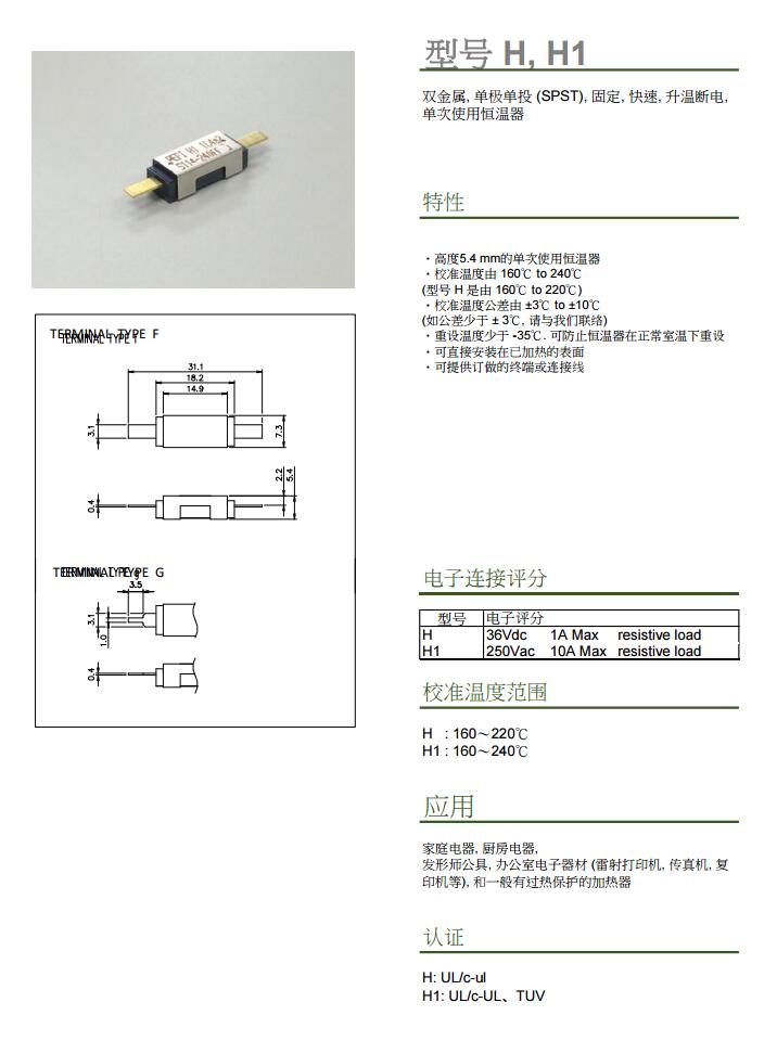 型號 H, H1溫控器,過溫保護
