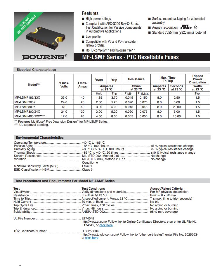 關鍵字:BOURNS 車規保險絲 MF-LSMF AEC-Q200認證 車規認證保險絲 車規級保險絲
