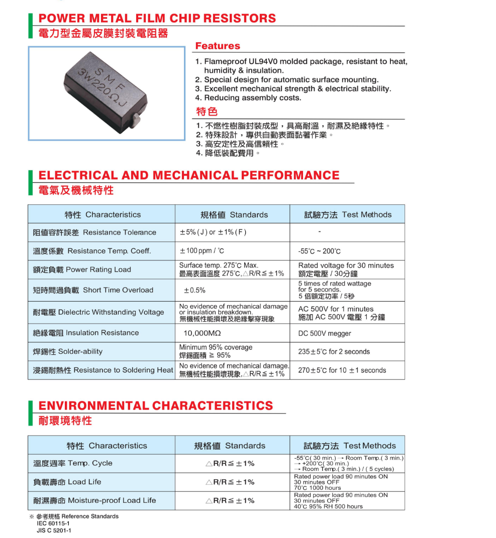 關鍵字:SMF 電力型金屬皮膜封裝電阻器