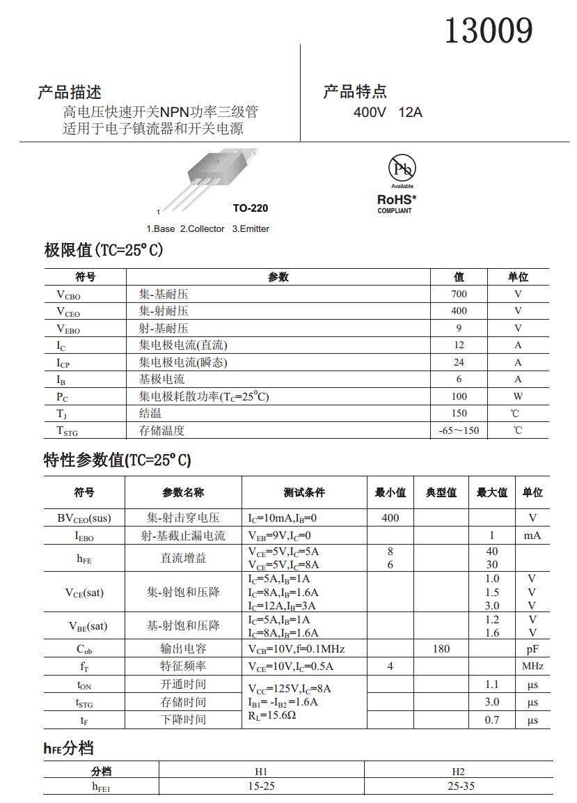 13009 400V 12A TO-220 高電壓快速開關(guān)NPN功率三極管
