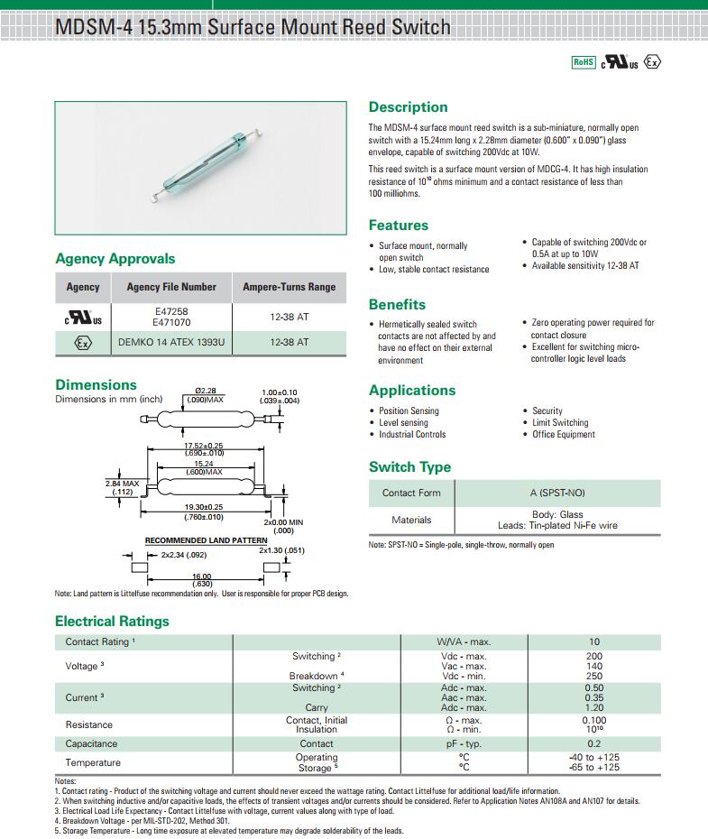 MDSM-4 系列 - 15.3mm表面貼裝磁簧開關|HAMLIN|干簧管